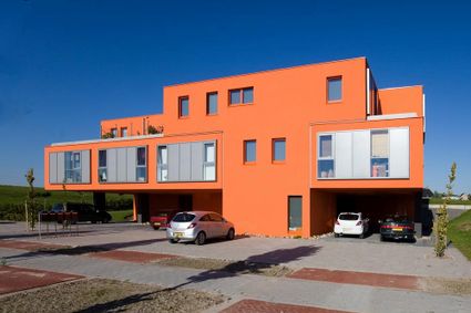 De knaloranje Villa van Vijven in Overgooi is ontworpen voor vijf families. Het slimme ontwerp bi...