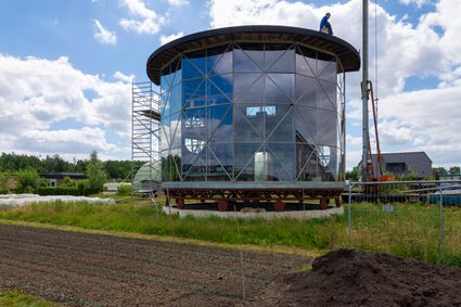 Dit cilindervormige huis, ontworpen door Joost Conijn, kan handmatig gedraaid worden om de zon te...